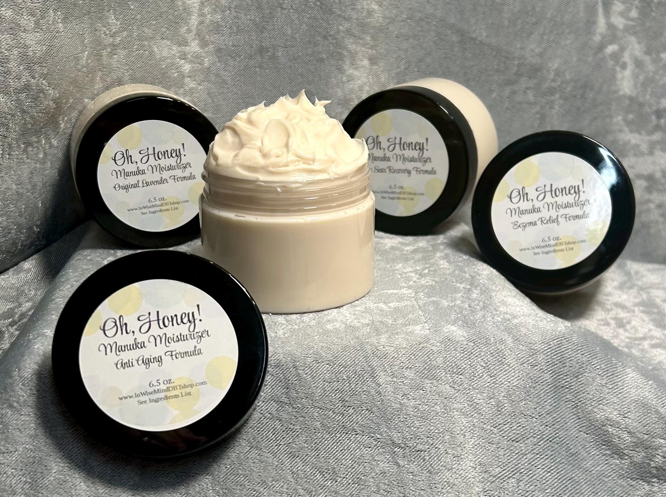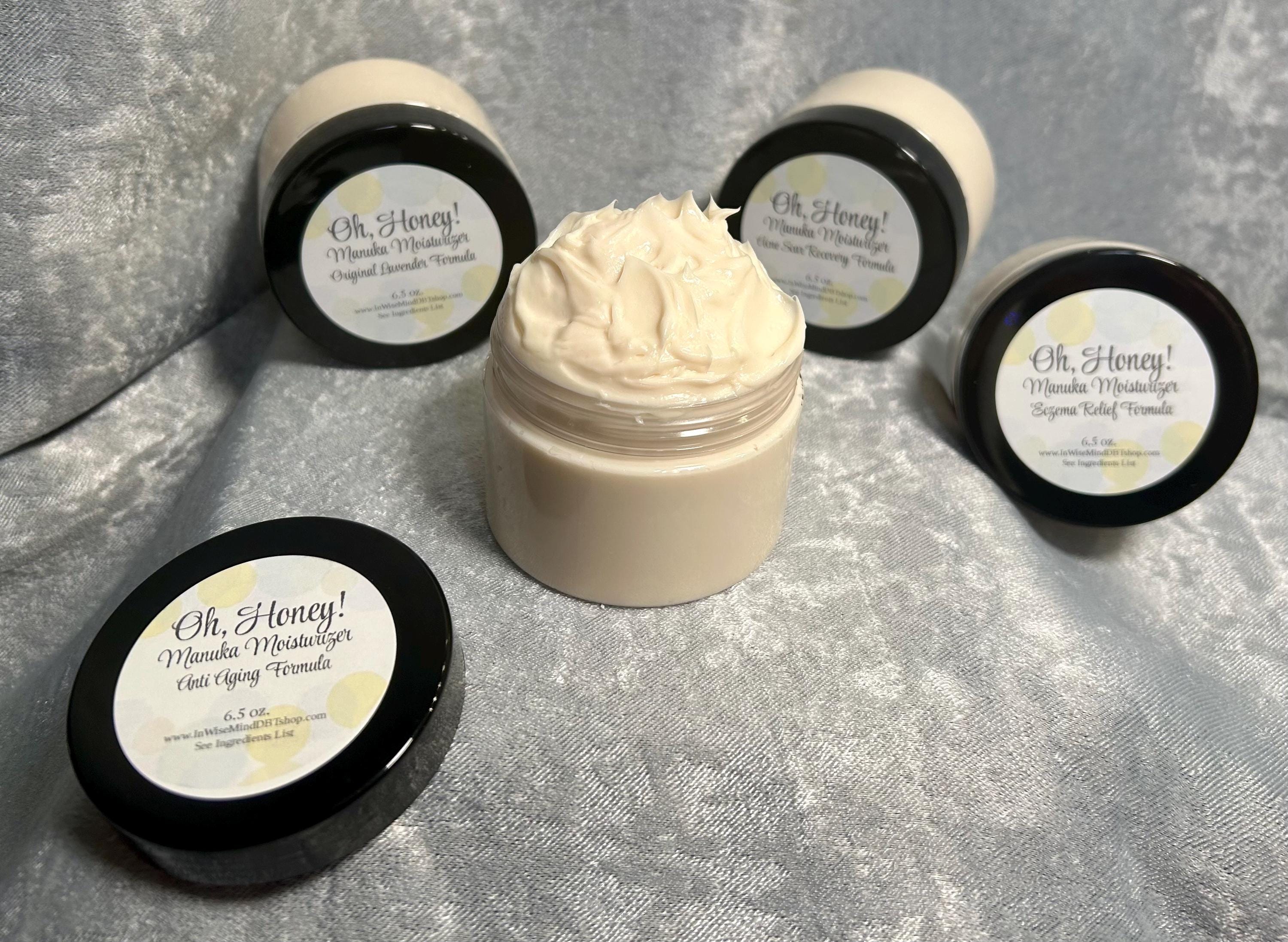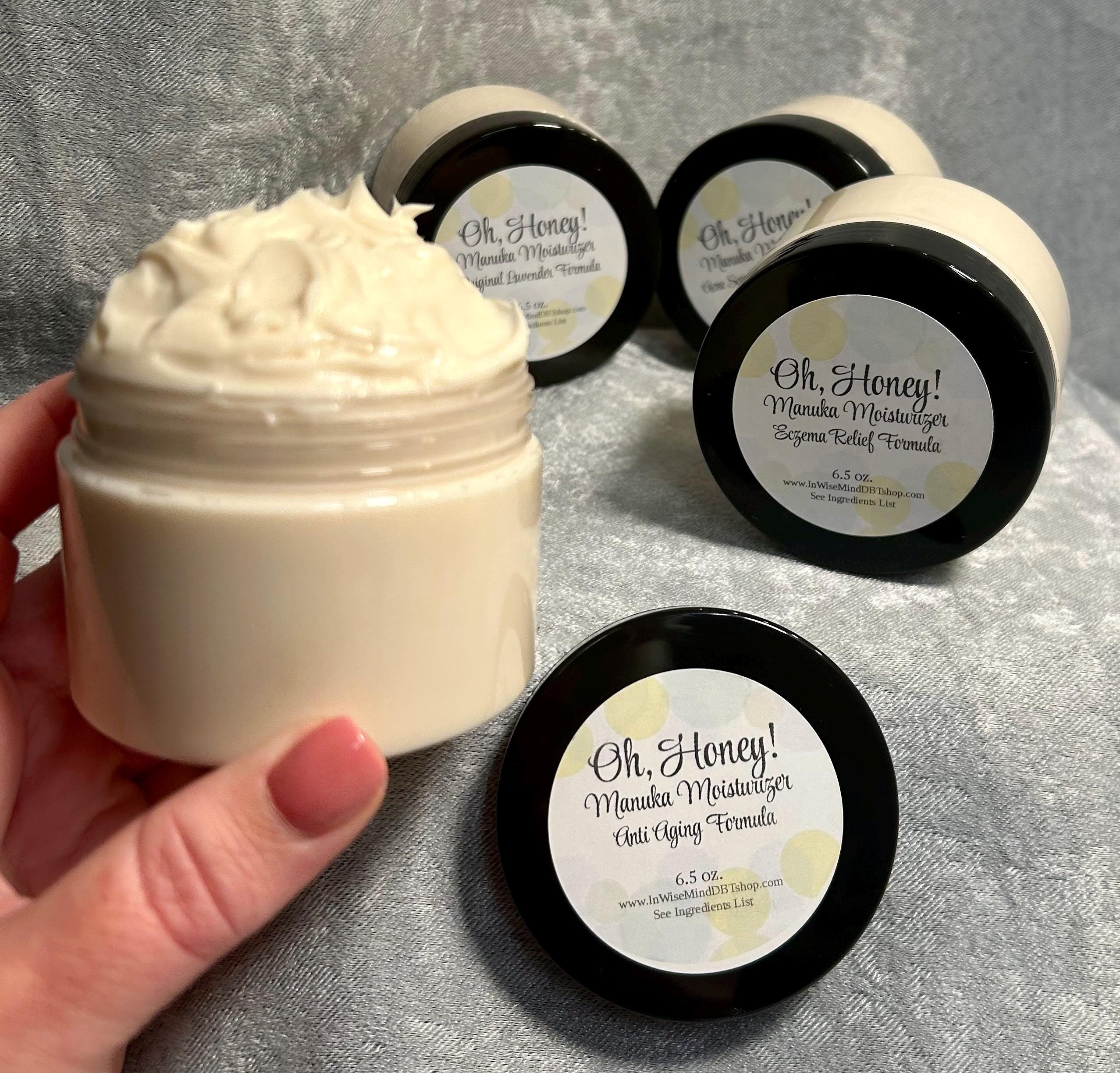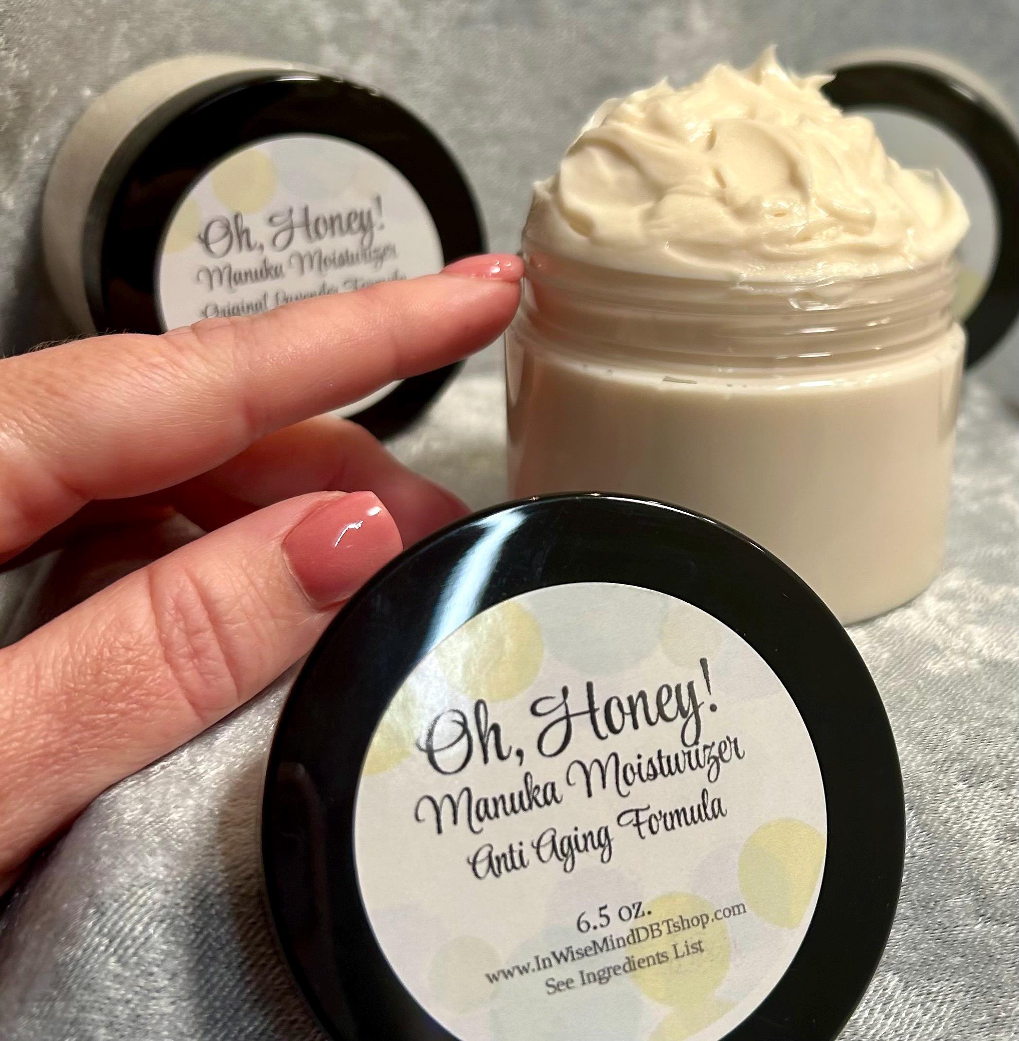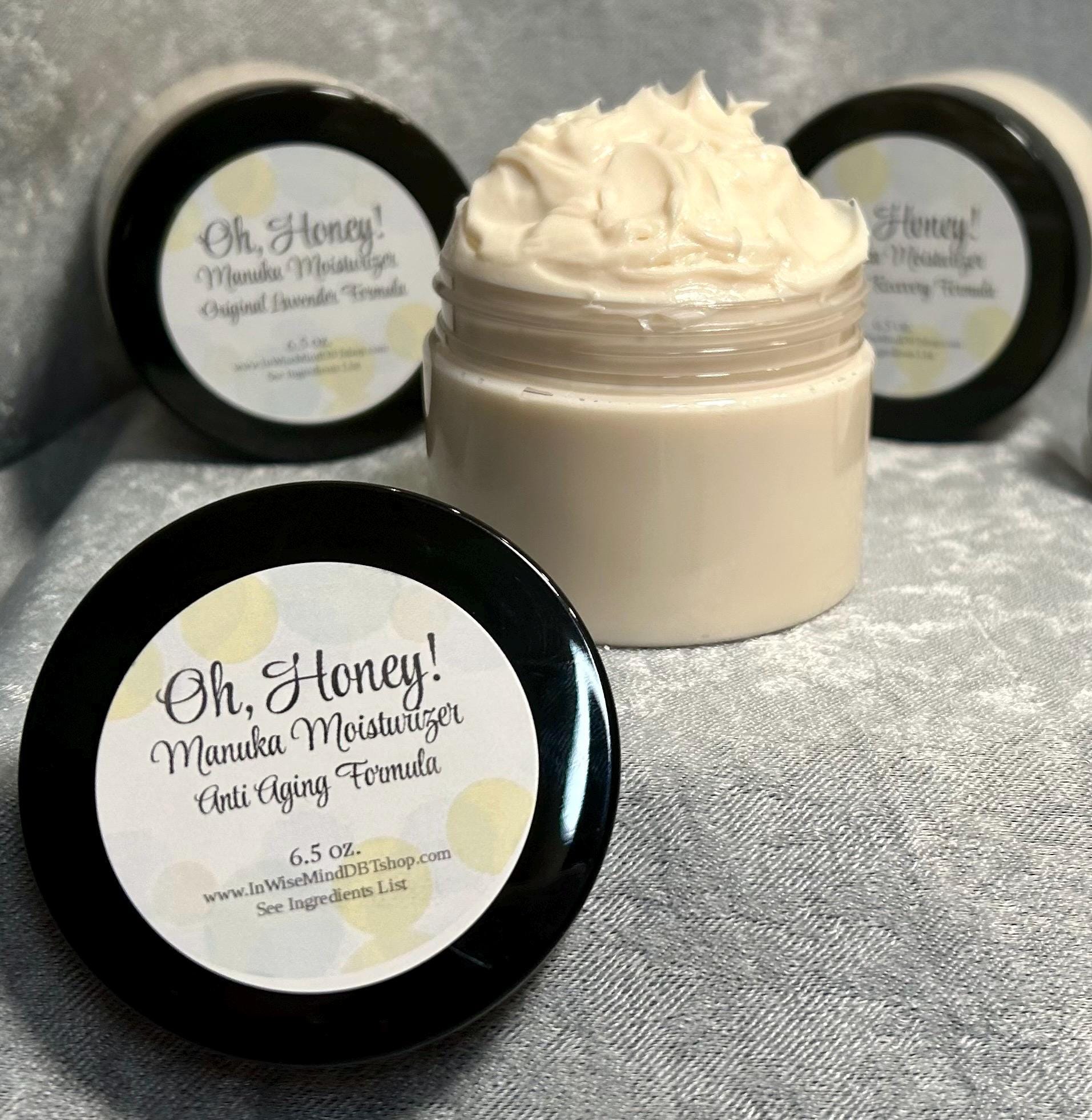 "Oh, Honey!" Is a REAL MANUKA HONEY BASED Therapeutic moisturizer AND skin repairing cream. It features GENUINE MANUKA HONEY, a hypoallergenic rich lotion base, premium Lavender Essential Oil, Organic Shea and Organic Cocoa Butters, and Vit E. Oil, and has more options with skin custom blends described below! Manuka Honey is THE Natural Beauty Secret for beautiful and healthy skin. This moisturizer is HAND MADE WHEN YOU ORDER and COMPLETELY CUSTOMIZABLE for your skin concerns. This is a very rich, moisturizing blended luxury cream with the best kept natural beauty secret for skin: REAL MANUKA HONEY from New Zealand! Hand crafted, small batch. Manuka honey is NOT table honey. It is highly rich in anti-inflammatory and antimicrobial properties, it is stringently regulated and can only come from the Manuka Tree in New Zealand, with the honey being responsible sourced and strict quality control procedures in order for it to make the grade as Manuka Honey. It is darker in color than "regular" honey, it is deeply moisturizing and a natural salve to repair skin. Many people also take it internally for its well known health benefits.