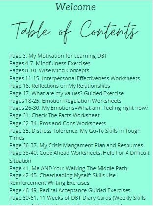 Topics covered include: Mindfulness, Interpersonal Effectiveness, Emotion Regulation, Distress Tolerance and Middle Path (Dialectical Perspective). Includes 11 weeks of DBT Skills Diary Cards. Unique Skills Self-Cheerleading Worksheets encourage building skill mastery and ability to give oneself credit for a job well done. Values Assessment worksheet helps clarify personal values that allow for setting personal boundaries better and also helps to brainstorm pleasant events that you may wish to add into your life to help build quality of life (a life worth living).