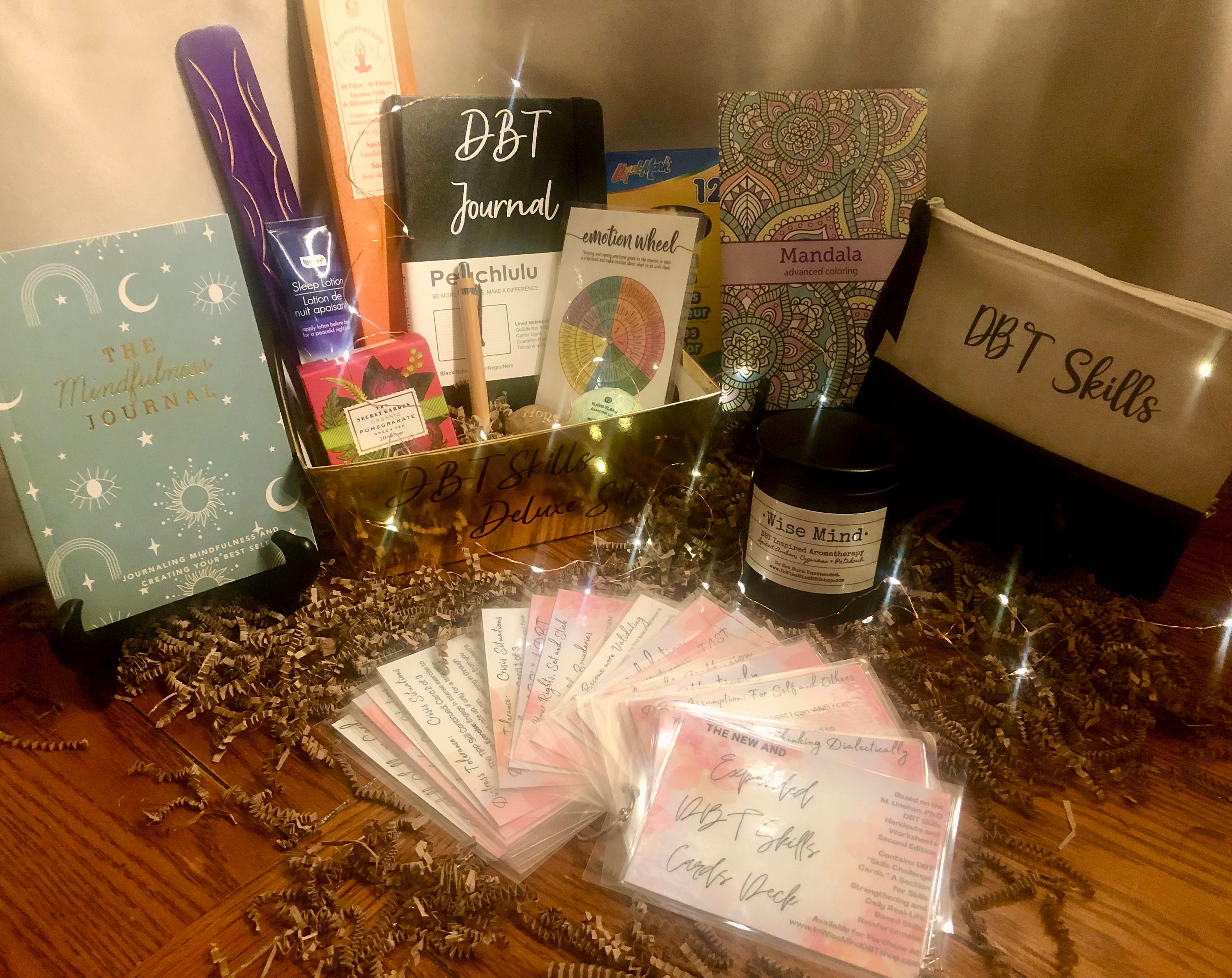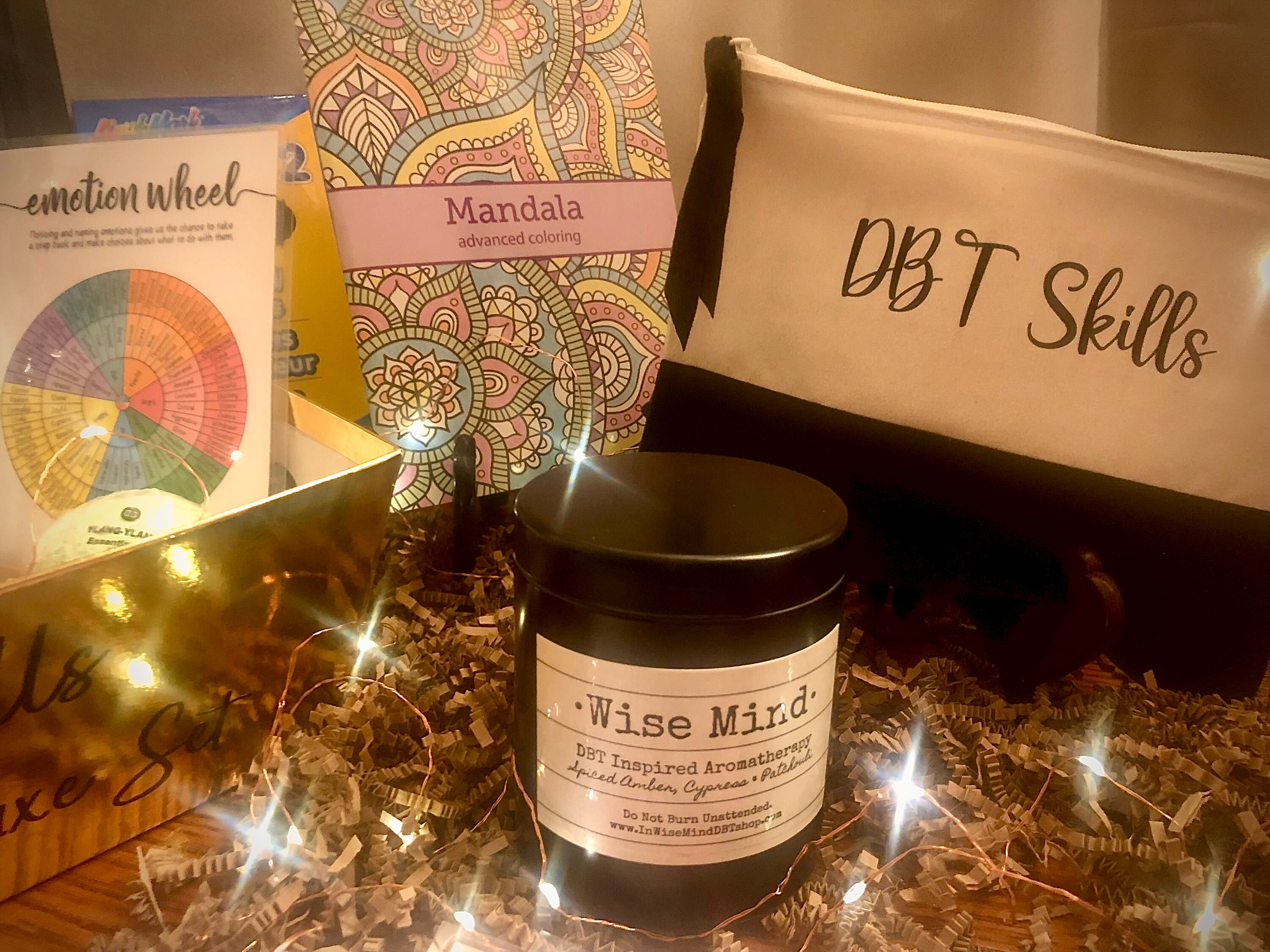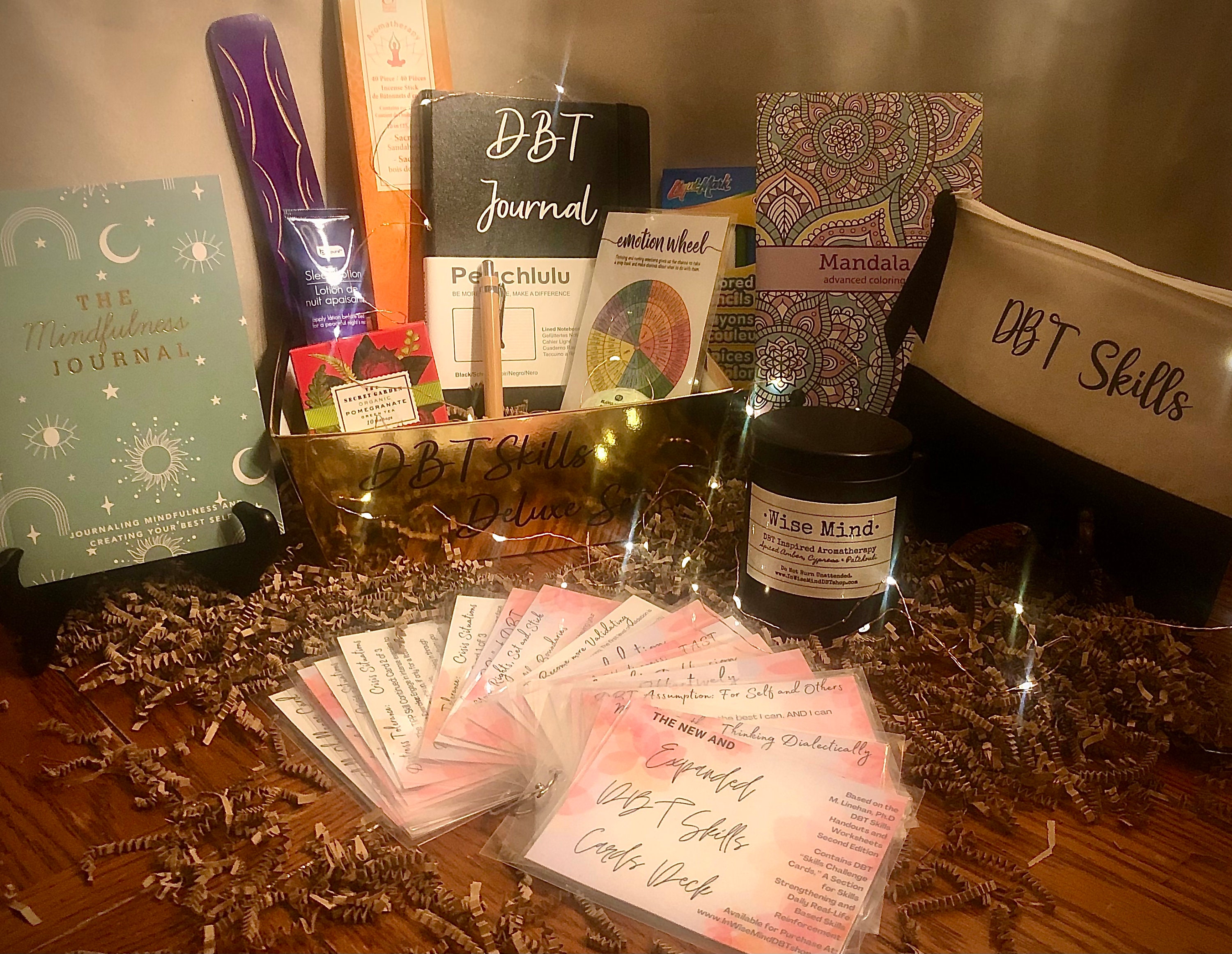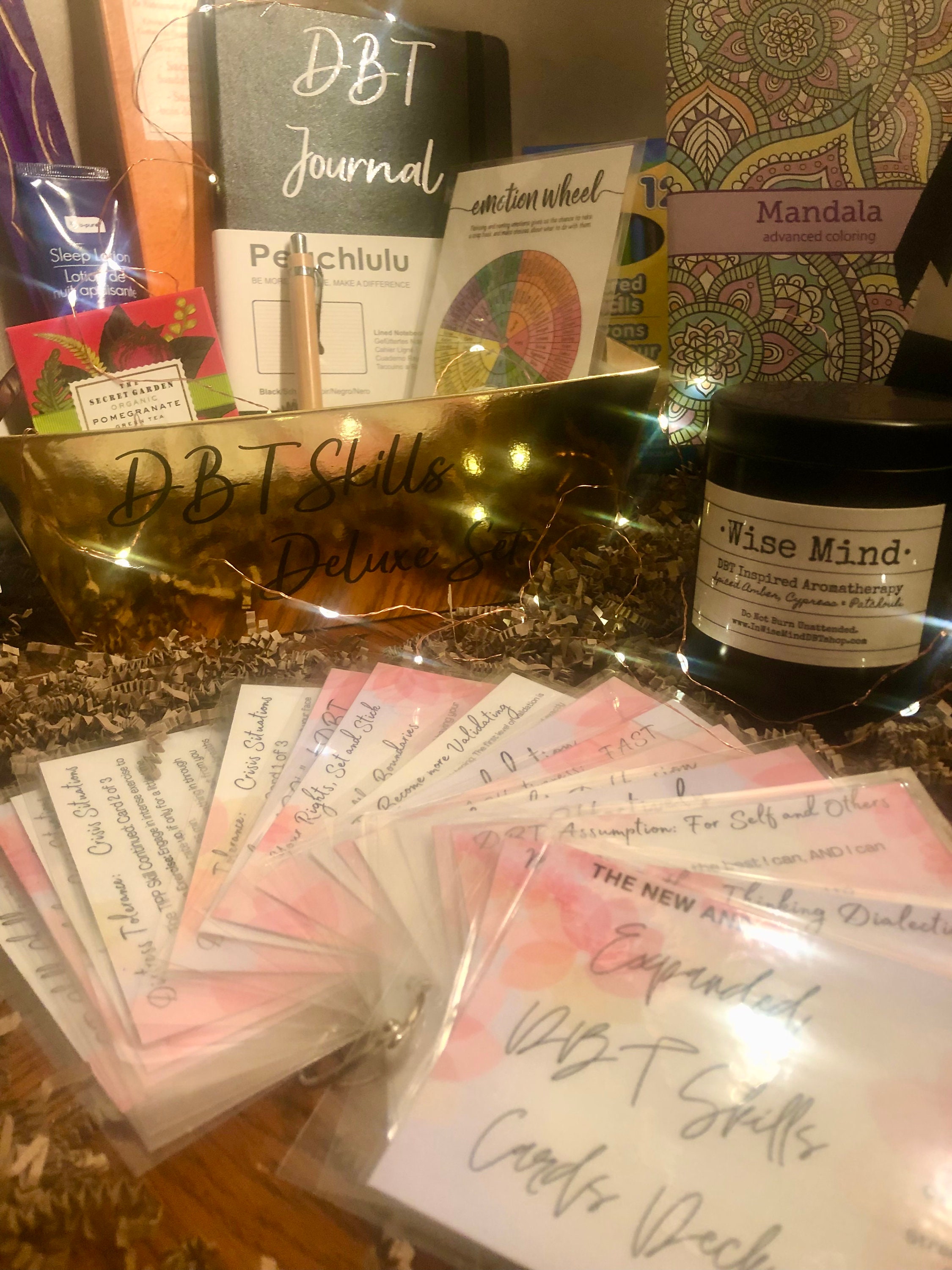 DBT (Dialectical Behavior Therapy) Deluxe Skills Set! Learn and review REAL DBT SKILLS and enjoy the variety of self-soothing support items along with reflective journals and a richly-scented "Wise Mind" Aromatherapy Candle. Handmade For You By A Certified DBT Therapist! Your Deluxe DBT Skills Set will include: