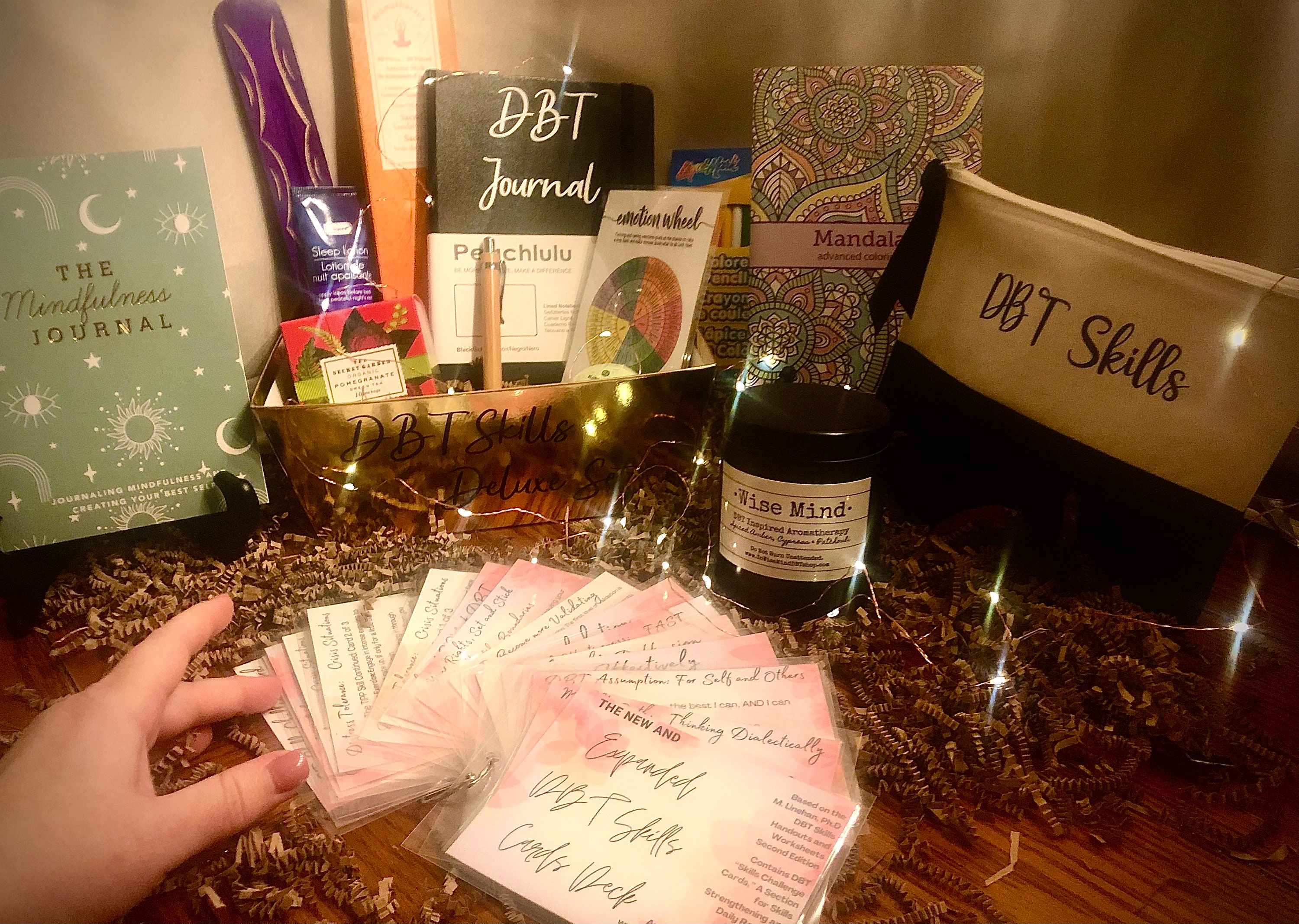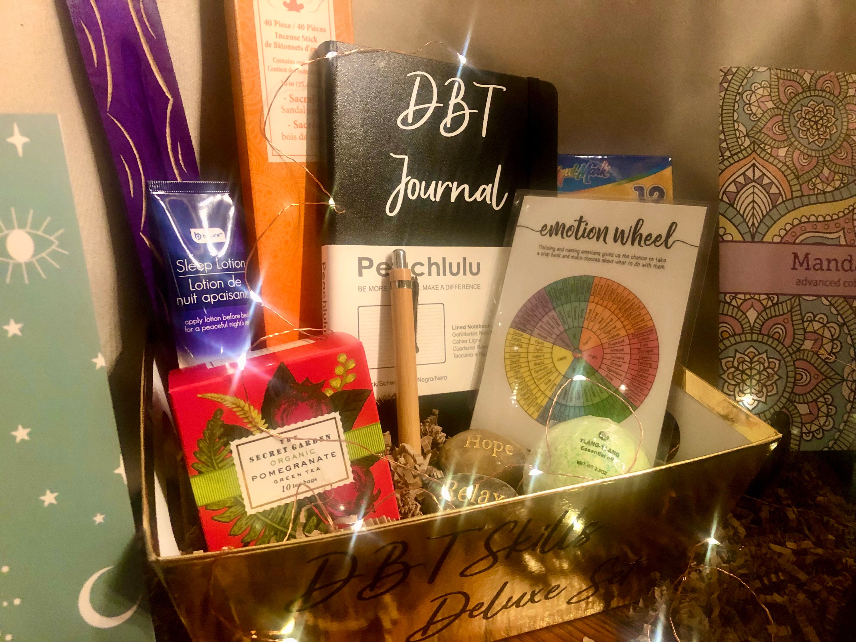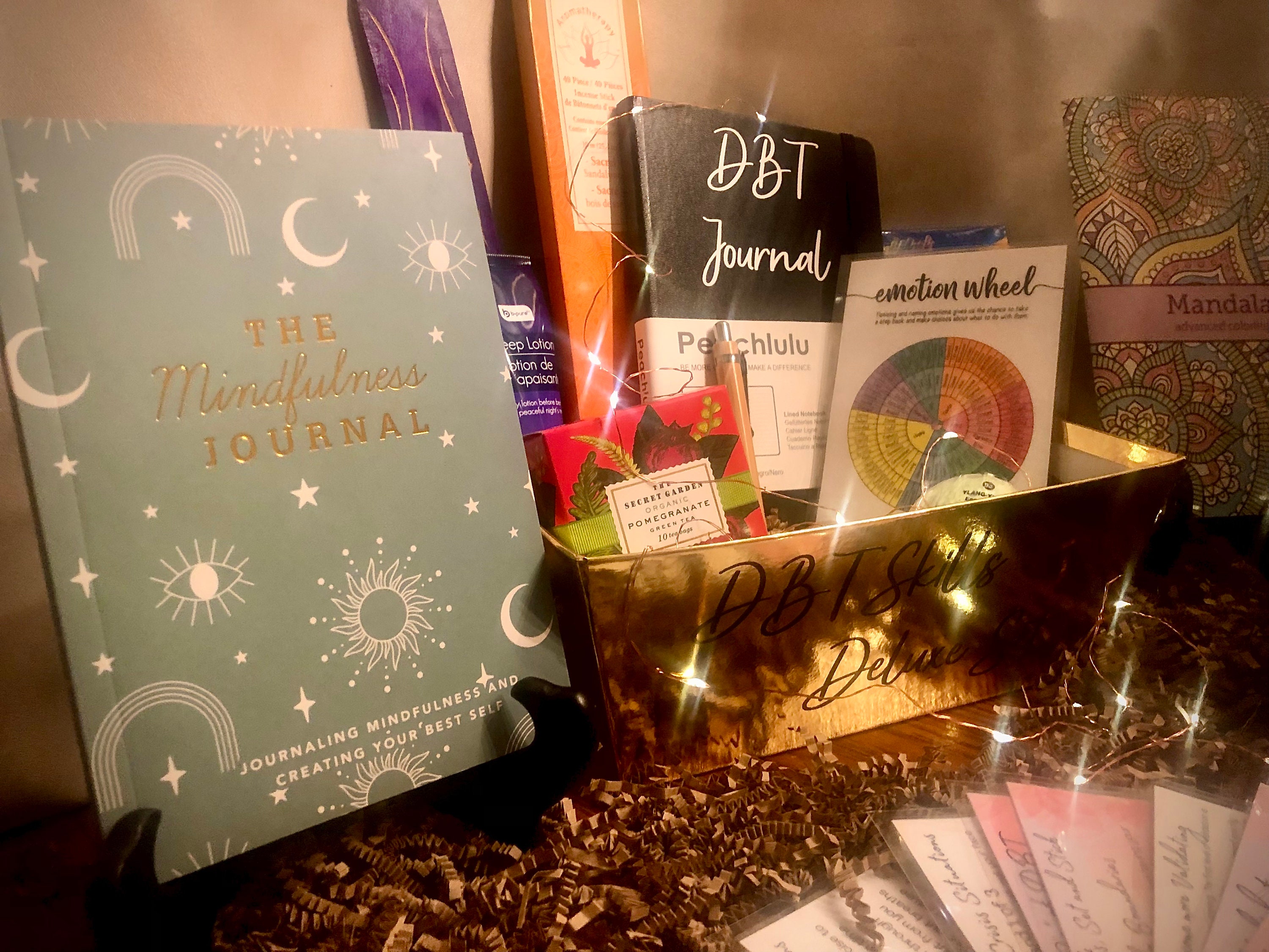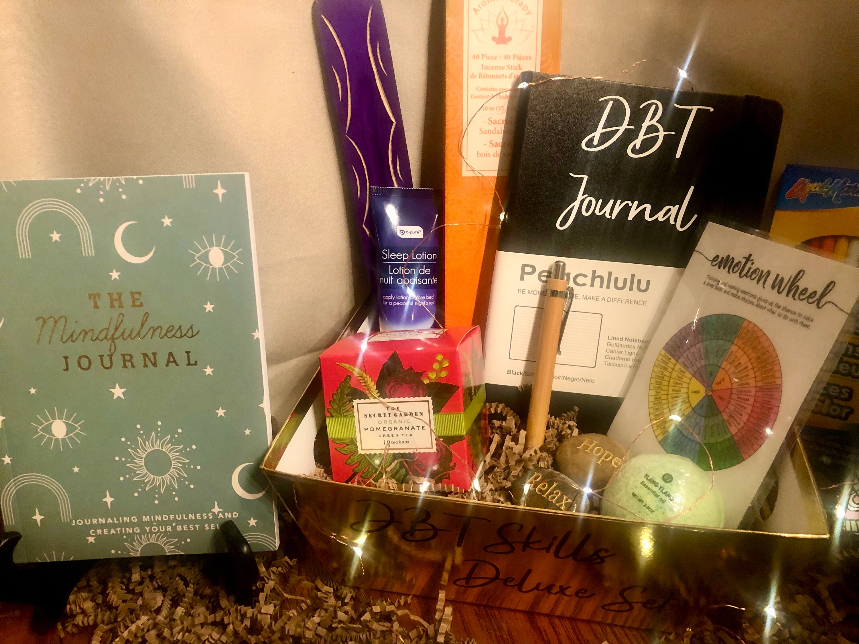DBT (Dialectical Behavior Therapy) Deluxe Skills Set! Learn and review REAL DBT SKILLS and enjoy the variety of self-soothing support items along with reflective journals and a richly-scented "Wise Mind" Aromatherapy Candle. Handmade For You By A Certified DBT Therapist! Your Deluxe DBT Skills Set will include: