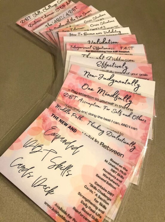 DBT stands for Dialectical Behavior Therapy and was developed by Marsha Linehan, PhD. These are REAL DBT skills cards, they help navigate emotions, interpersonal relationships; the cards also contain crisis and distress management strategies and help you build core mindfulness and goal effectiveness skills. ONLY THIS SET OF DBT CARDS were actually written and designed by a practicing DBT Certified Psychotherapist, who is also this Etsy maker. The cards are SOLIDLY BASED ON GOLD STANDARD REAL, Genuine Marsha Linehan, PhD model of DBT. Excellent for use in therapist or counselor offices, mental health practices, for members attending a DBT Skills Group or for Skills Trainers, great for graduates of DBT therapy programs or excellent for those just starting their journey in DBT with a qualified mental health professional.
