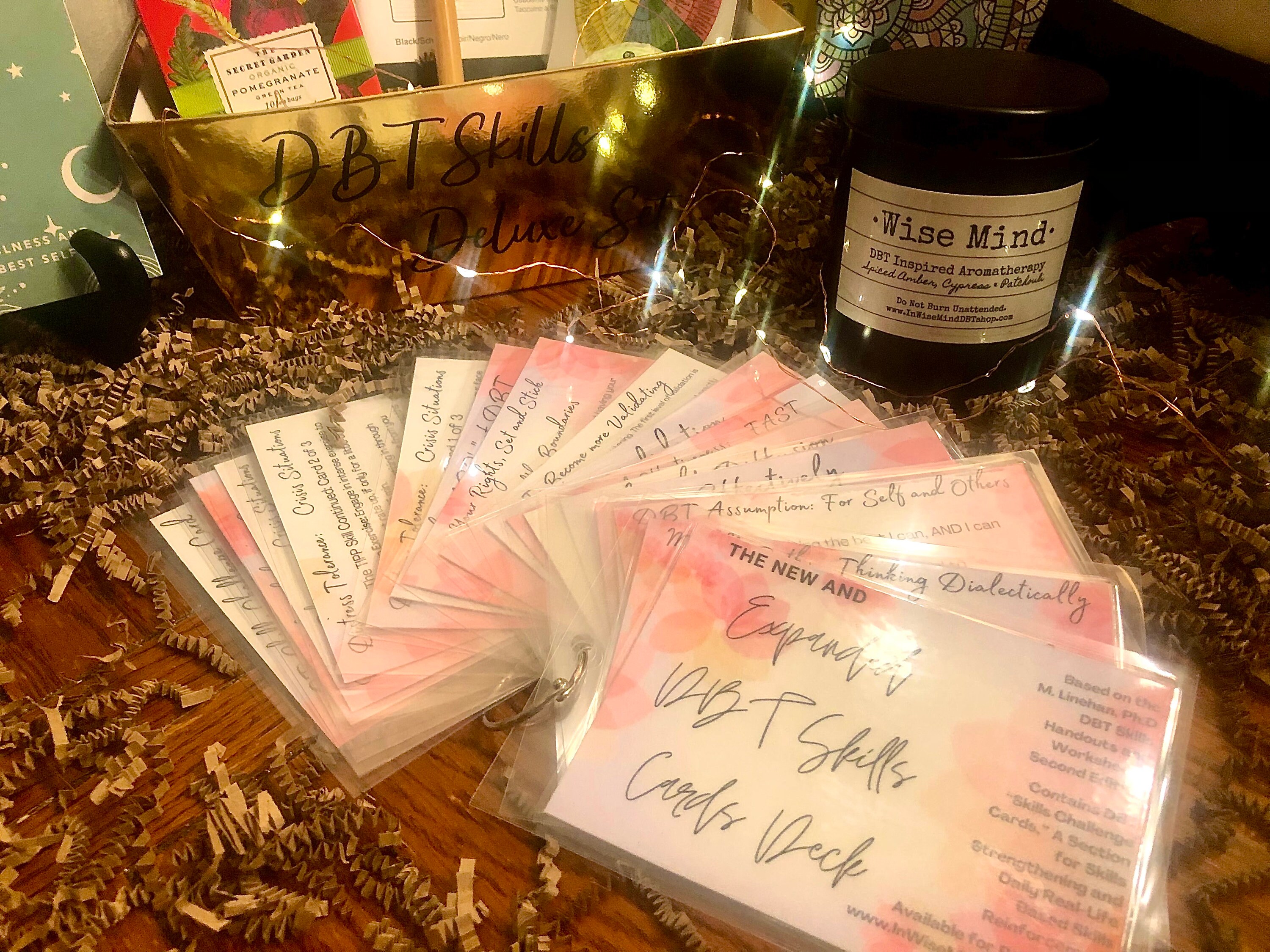 *Beautifully arranged for you in a "DBT Skills Deluxe Set" Decor Box, metallic gold color, with kraft color decor paper shreds. Your DBT Skills Deluxe Set will be wrapped with a decor clear cello bag and topped beautifully with a coordinating bow.